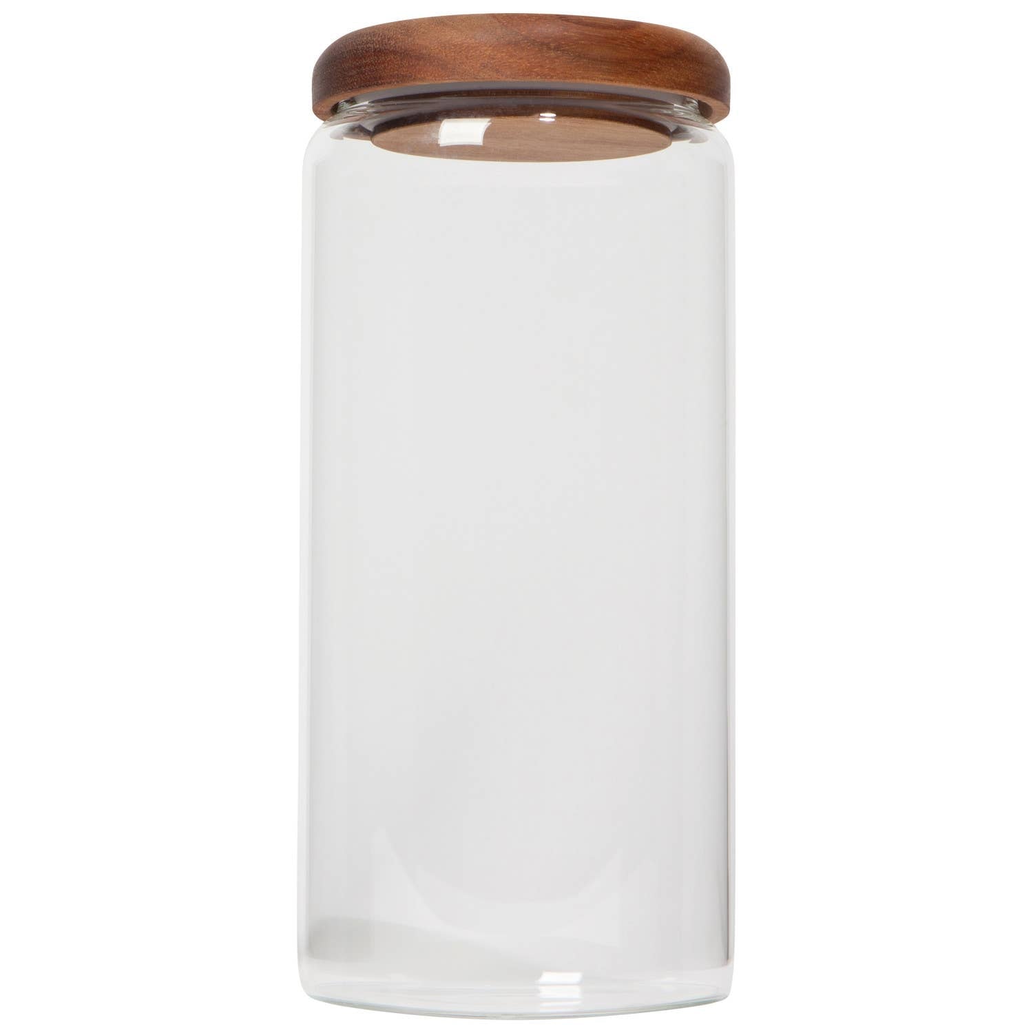 This glass jar with acacia wood lid offers an elegant food storage solution. Made of food-safe materials, this jar is stylishly suitable for use in and out of the kitchen. Features a wide mouth and silicone rubber seal to preserve freshness.
