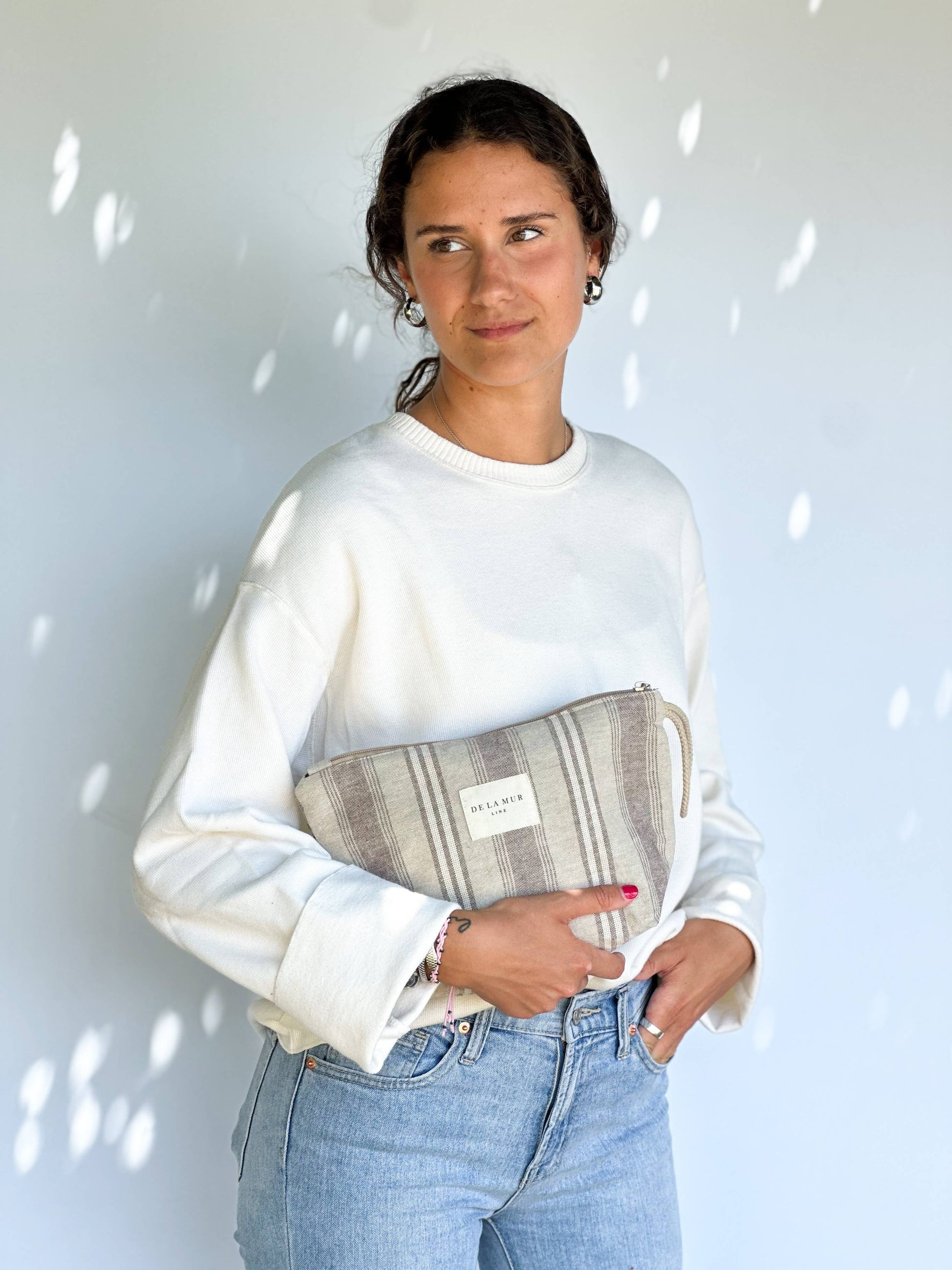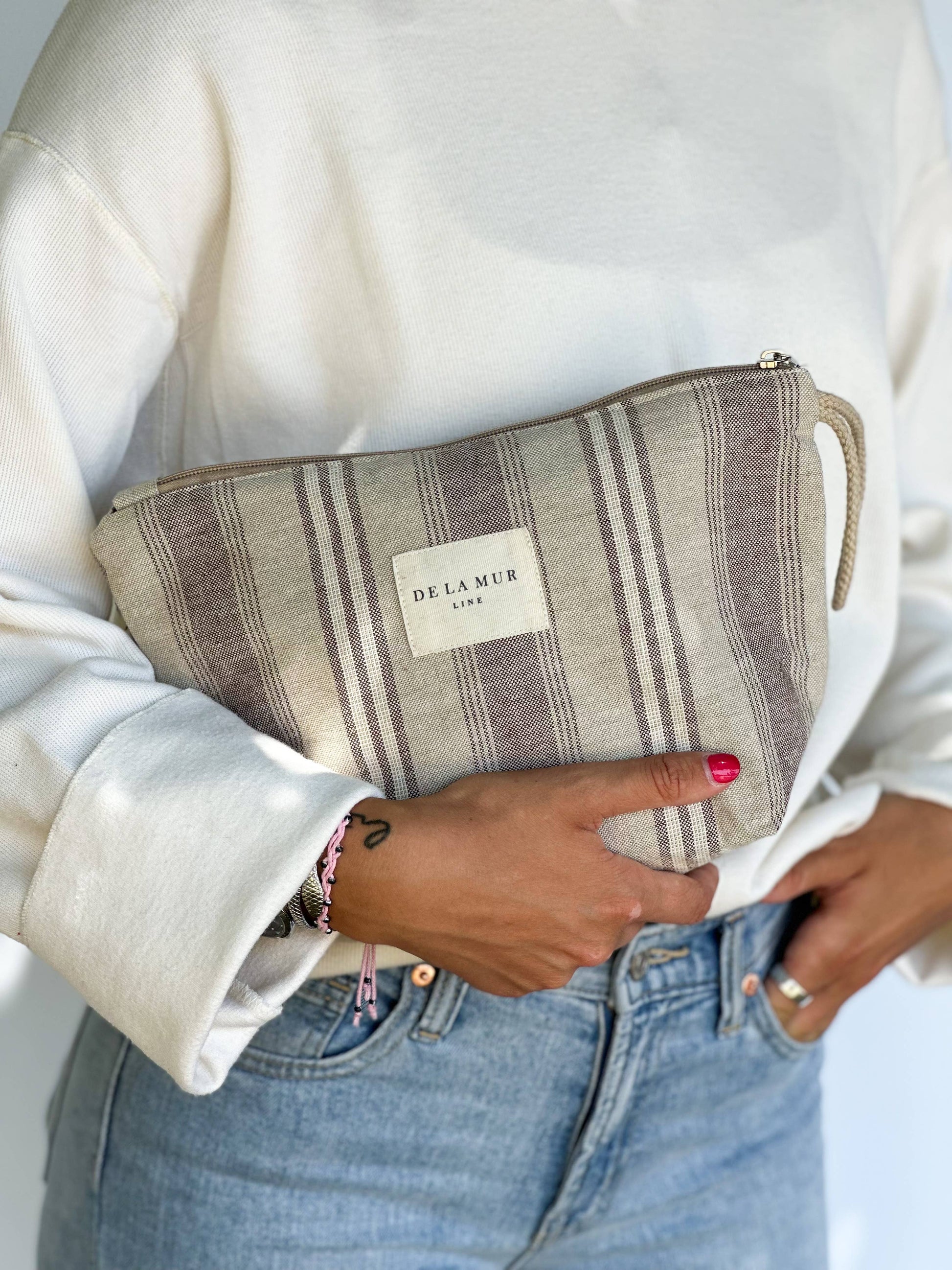 Toiletry bag with a zipper at the top and a beige cord handle on the side. Made of thin striped fabric in beige and brown tones. Lined with thick gray fabric on the inside. To maintain it properly, hand wash cold and avoid using a dryer.