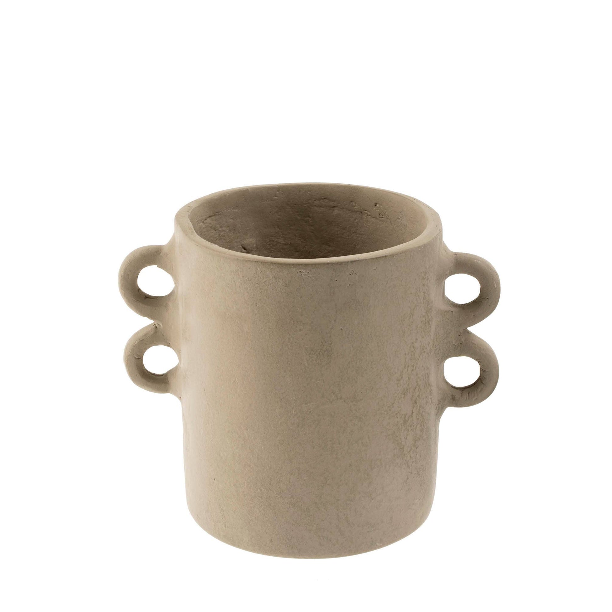The Venera Paper Mache Vase is handcrafted from sustainable papier mâché and has a buff coloured limewash-like matte finish. We love the organic feel this piece adds, it’s double looped handles on each side adding a sense of primitive style. Made from recycled newspaper that’s mixed with water then chalk and tree sap crystals are added to turn the substance into a clay-like material. The pulp is kneaded into chapati-like forms, then rolled and moulded into the sculptural objects we love. There is no firing, no power used, and the process is entirely eco-friendly. Each piece will have subtle differences in finish and these variations are part of the handmade appeal. Porous in nature, papier maché should not be exposed to liquids.
