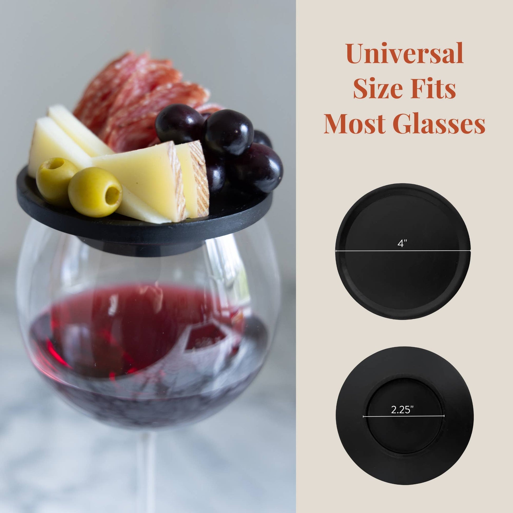 Transform the way you entertain with our Charcuterie Wine Glass Toppers, inspired by the viral social media trend. - Set of 4 - Crafted from premium wood - Finished with a chic, black, non-toxic sealant - Stain-resistant and easy to clean Made with a universal size to fit a variety of wine glasses, they’re perfect for holding charcuterie bites while keeping your hands free to mingle. Designed to complement our signature charcuterie gift sets, these wine glass appetizer plates make a delightful and practical addition for entertaining or as a gift.