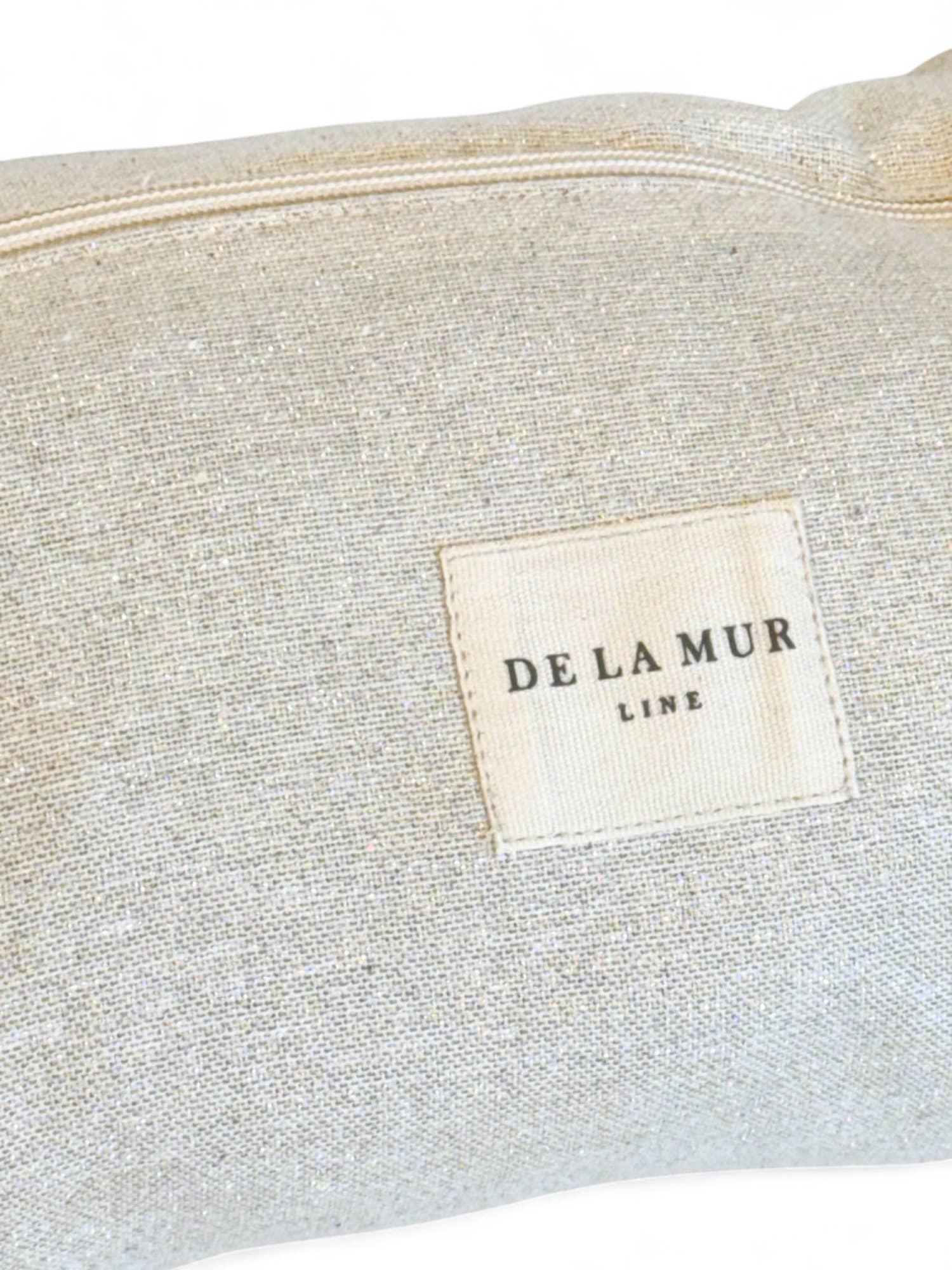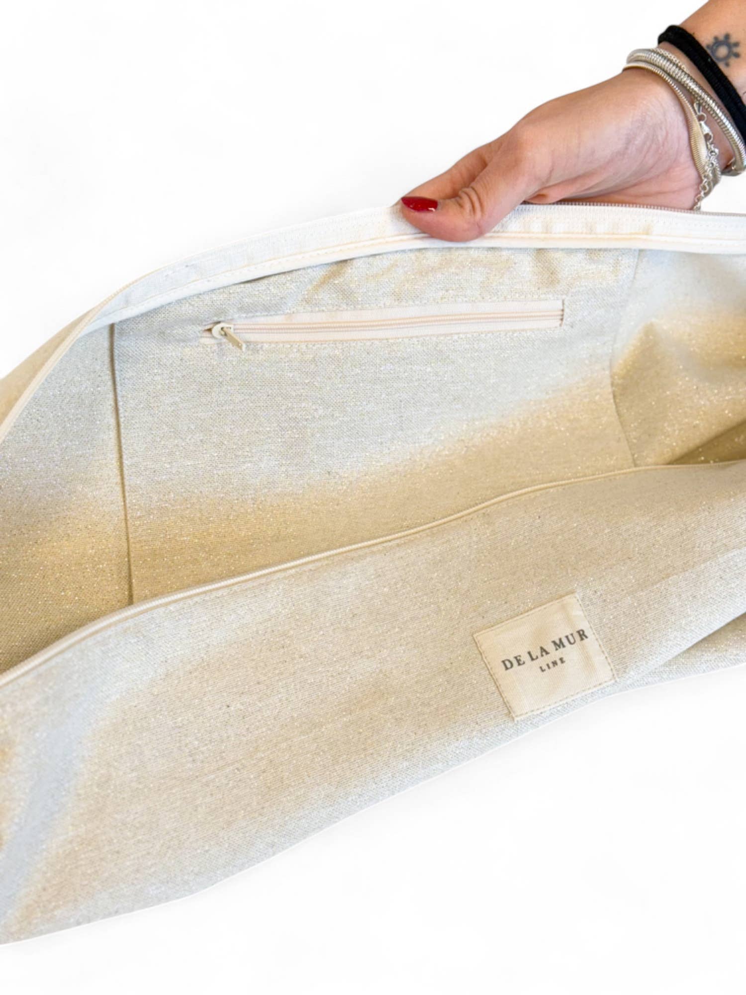 Made from lightweight half-panama fabric in beige with shiny gold and silver lurex accents, with an interior zipper pocket.